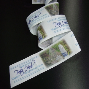 • Möglich ist der Druck auch auf farbigen Bändern. Die Farben ändern sich, jedoch mit interessanten Effekten. Preise auf Anfrage.