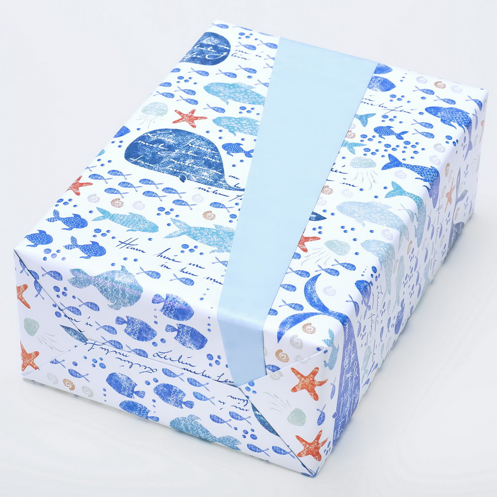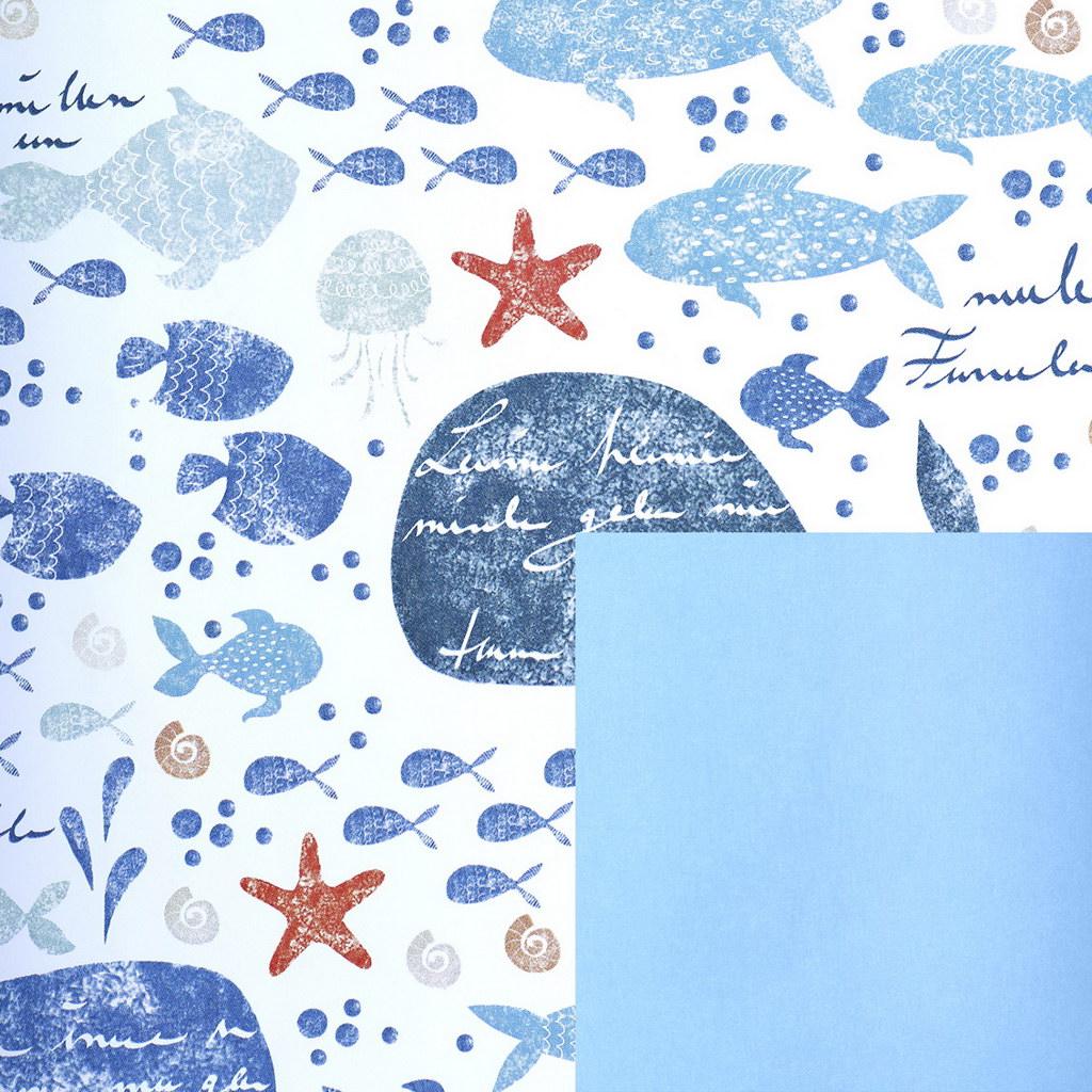 Design: Vorderseite: Maritime Motive wie Fische, Wale und Seesterne auf weißem Untergrund; Rückseite: hellblau, uni
