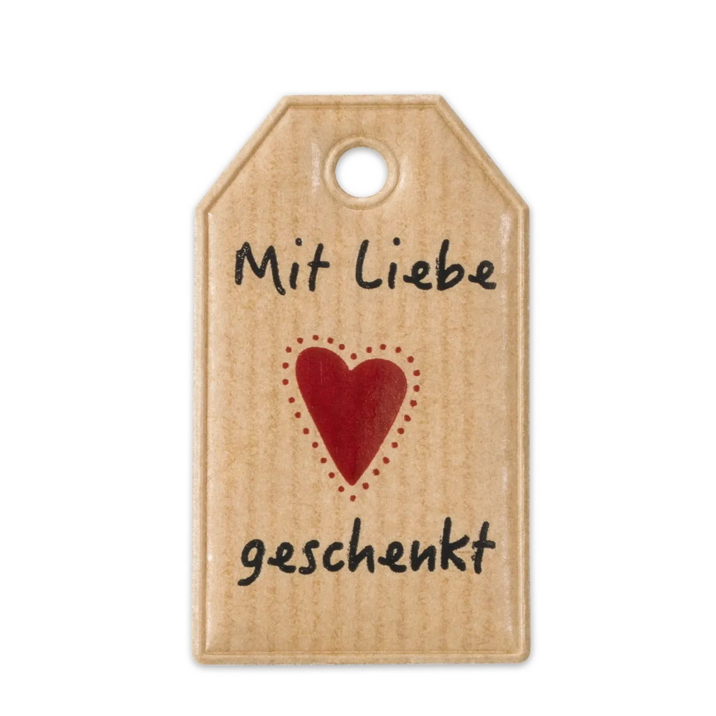 Die rechteckigen Geschenkanhänger für Präsente sind bedruckt mit dem Text: "Mit Liebe geschenkt". Abgebildet ist zudem ein rotes Herz. An den Papieranhängern befindet sich am oberen Rand ein kleines Loch, um bei Bedarf eine Befestigungsschnur durchziehen zu können.