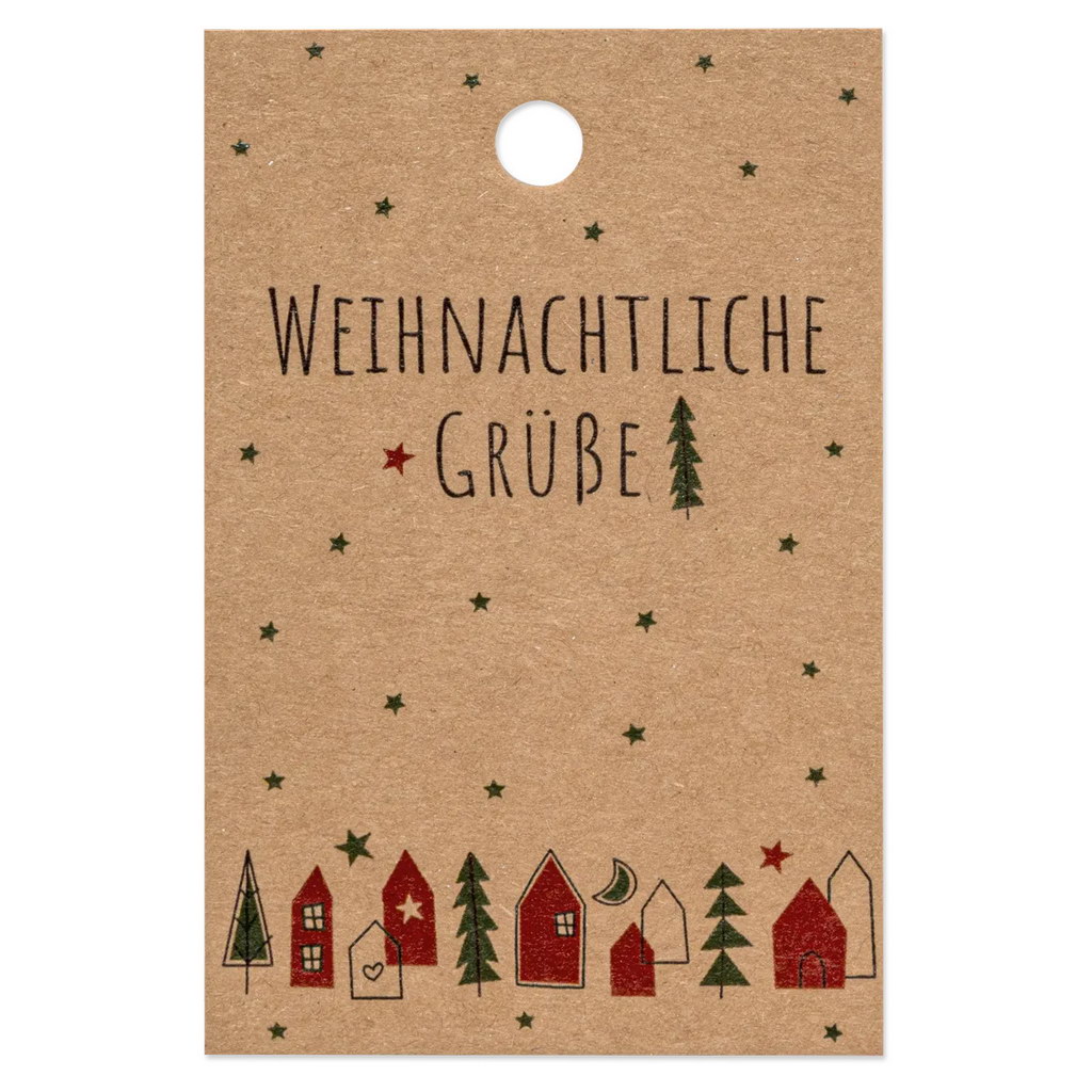 Die rechteckigen Geschenkanhänger für Präsente sind bedruckt mit dem Text: "WEIHNACHTLICHE GRÜßE". Abgebildet ist zudem eine weihnachtliche Umgebung. An den Papieranhängern befindet sich am oberen Rand ein kleines Loch, um bei Bedarf eine Befestigungsschnur durchziehen zu können.