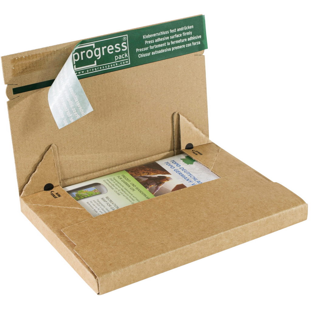 Die flache, braune Versandbox ist postoptimiert als Großbrief und hat einen Selbstklebeverschuß sowie Aufreißfaden