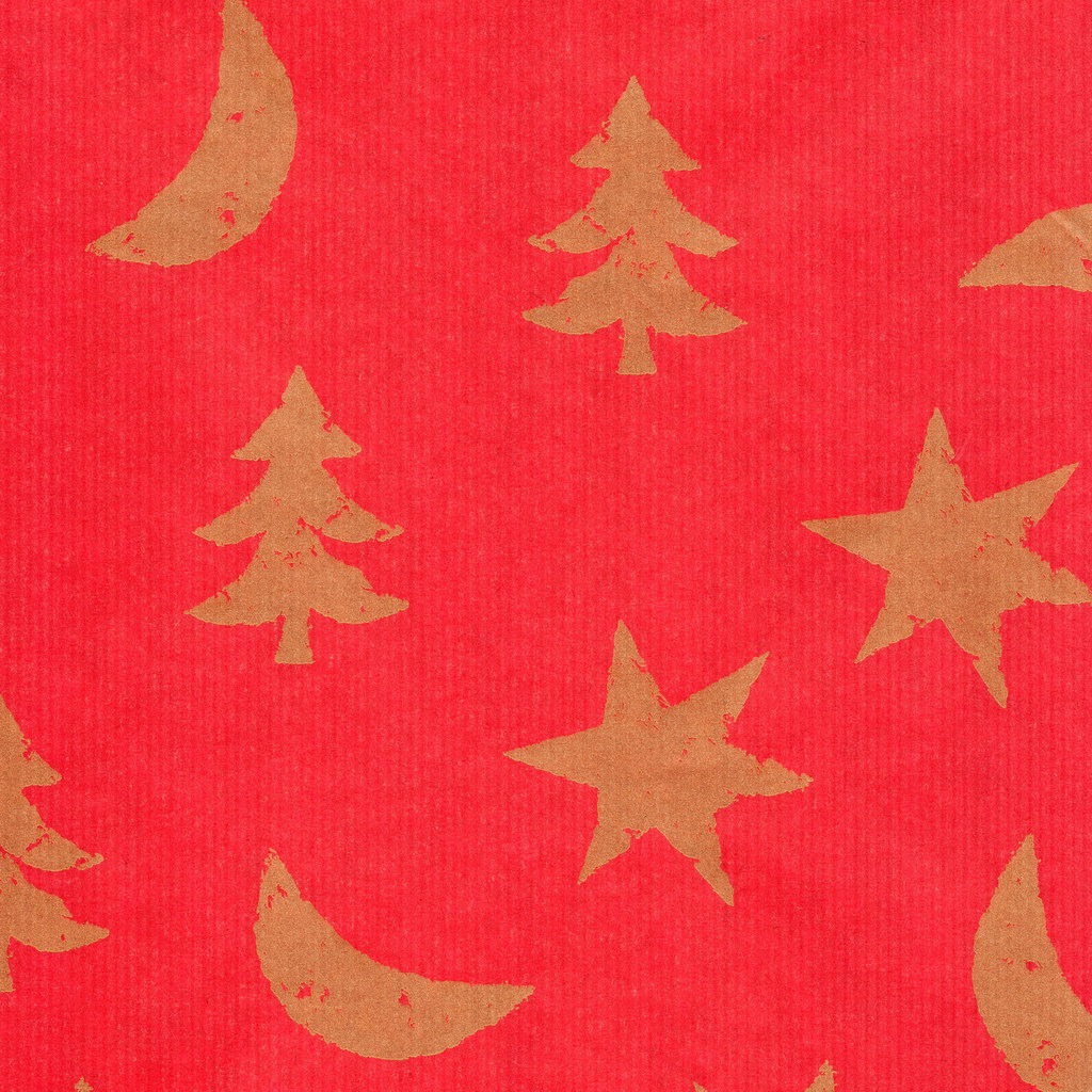 Design: Motiv mit Tannenbaum, Stern, Mond in gold auf rotem Untergrund