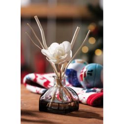 Raumduftspender "Beauty Flavour" – Dekoglas mit schimmerndem schwarzen Boden, verschiedene Holzstäbchen und Blume, mit aromatischem Jasminöl in transparentem Fläschchen (ca. 100 ml), in Box mit Papiereinleger