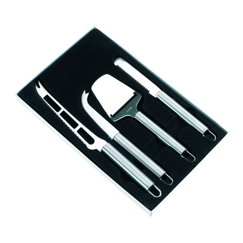 bestehend aus Weichkäsemesser, Hartkäsemesser, Käsehobel und Messer mit Wellenschliff, alle Messer mit praktischer Aufhängöse
