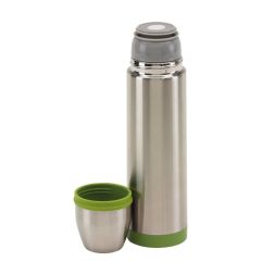 Edelstahl-Isolierkanne "Keep warm", doppelwandig: innen Kunststoff-Ausgießer mit Schnellverschluss und Schraubgewinde, Kannenboden und Verschlussdeckel mit farbigen Applikationen, Füllmenge ca. 0,5 Liter, in Geschenkbox