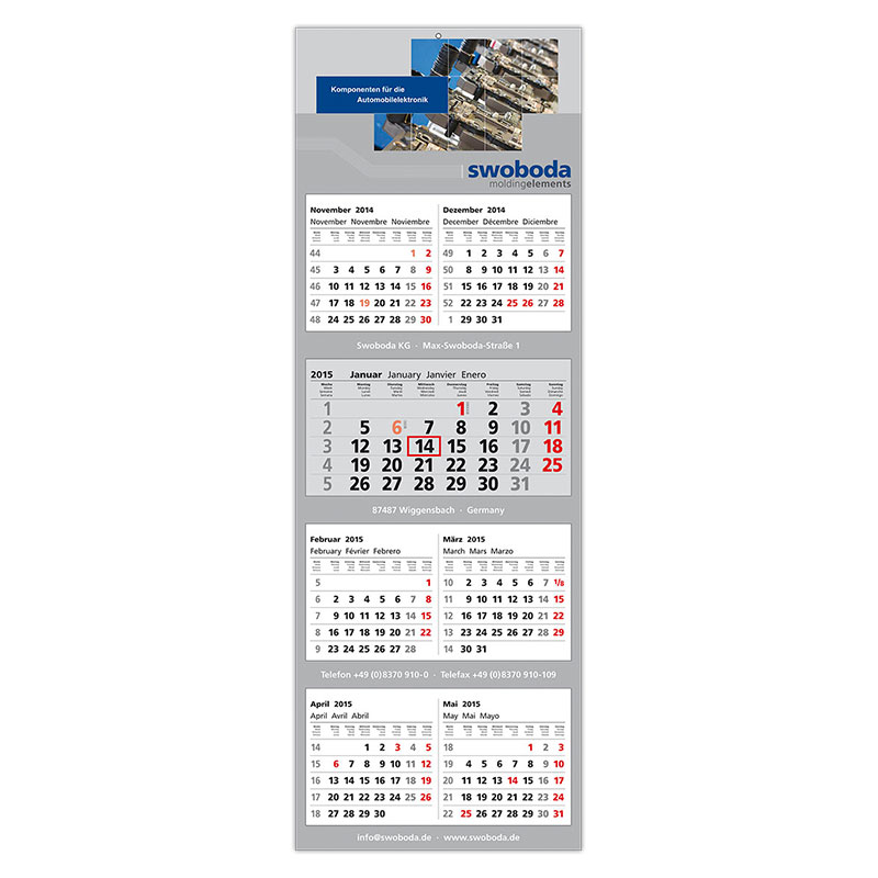 Design: Kalendarium weiß/grau/weiß/weiß mit Ziffern schwarz/rot; dt. Feiertagen in rot, internationale Feiertagskennzeichnung, 4-sprachig (D/GB/F/E)