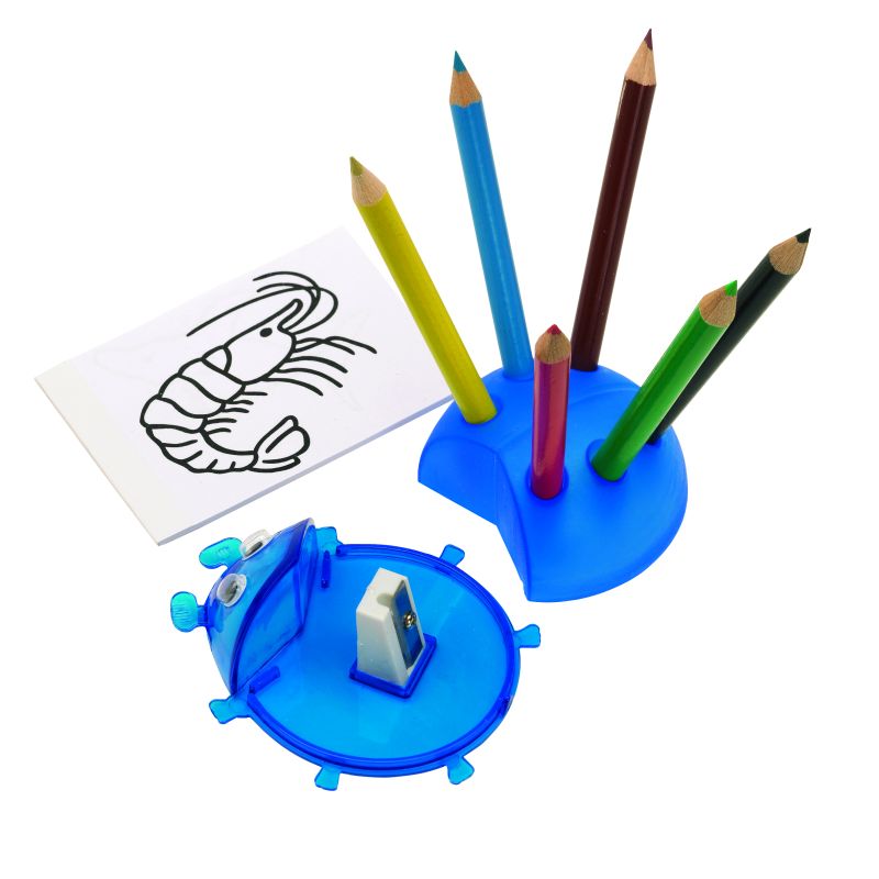 Stifteständer "Ladybug": mit integriertem Anspitzer, 6 lackierten Buntstiften (angespitzt) und kleinem Malbuch mit Motiven zum Ausmalen, in transparenter Box
