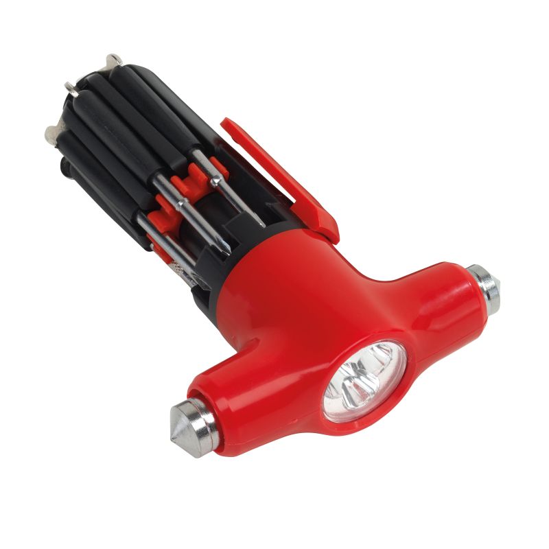 Schraubendreher-Set "9in1" – mit Hammer und Licht: 7 ausklappbare Torx, Kreuz- und Schlitzschraubendreher, oben in der Mitte der Scheibenbrecher mit integrierter Taschenlampe (3 LED), An- und Ausschalter befindet sich am Befestigungsclip, in schwarzer Box