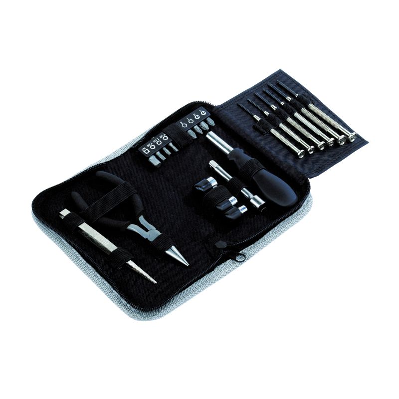 24-teilig: inkl. 3 Schlitzschraubendreher, 3 Kreuzschraubendreher, Zange, Pinzette, Schraubenzieher mit verschiedenen Aufsätzen, im Reißverschluss-Etui