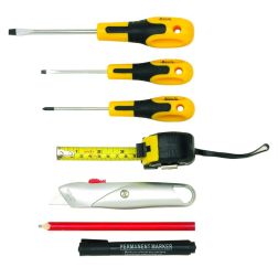 mit verstellbarem Hüftgurt: 3 Schraubendreher, 3m-Maßband, Cutter, Zimmermannsbleistift und schwarzer Marker