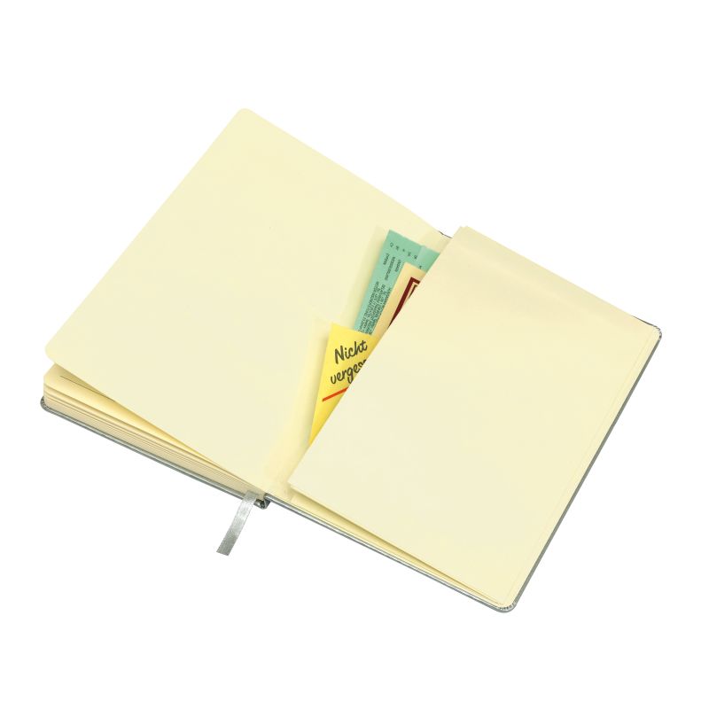Notizbuch "Attendant" im DIN-A5-Format mit abgerundeten Ecken: Gummiband zum Verschließen, mit integriertem Lesezeichen und am Ende mit extra Falttasche zur Aufbewahrung von Notizzetteln