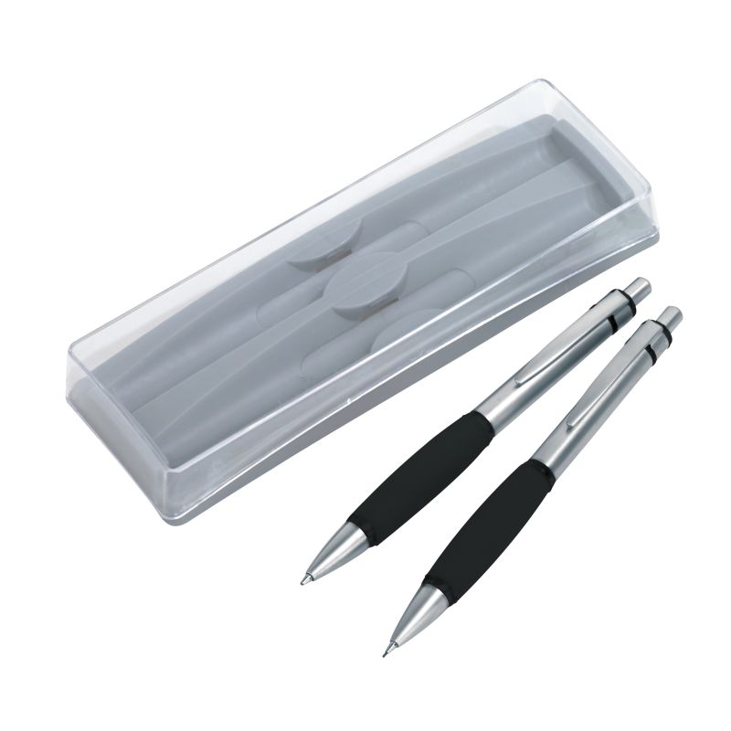 Schreibset "Penfan": bestehend aus Druckkugelschreiber (schwarzschreibend) mit Großraummine und Bleistift, gummierte Griffzone, im Etui mit transparentem Deckel