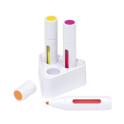 Textmarker-Set "Triple Star": bestehend aus 1 Stifteständer, 3 Textmarkern mit Flüssigtinte (pink, gelb, orange) mit farblich gekennzeichneter Verschlusskappe und Sichtfenster zur Kontrolle der Füllmenge