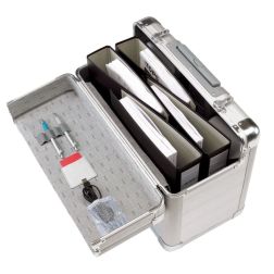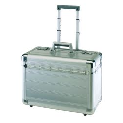 Pilotenkoffer "Office" auf Trolley - aus Aluminium, Kombinationszahlenschlösser, integriertes Teleskopsystem, Tragegriff, leichtlaufende Skaterrollen, komplettes Textil-Innenfutter, sehr großes geräumiges Hauptfach mit gepolstertem Laptopfach, 1 Netzfach und 2 Klettverschluss-Steckfächer, außerdem 4 Stifteschlaufen, 1 Visitenkartensteckfach und 1 Netzfach im Deckel