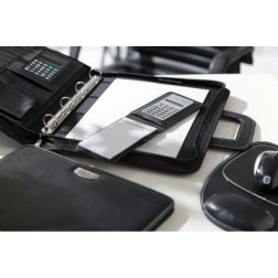 Notizmappe "Noblesse": mit Taschenrechner, kleinem Schreibblock, Stifteschlaufe, weißen Schmuck- und Kantennähten, aus hochwertigem Kunstleder mit Metallplättchen für Ihr Logo